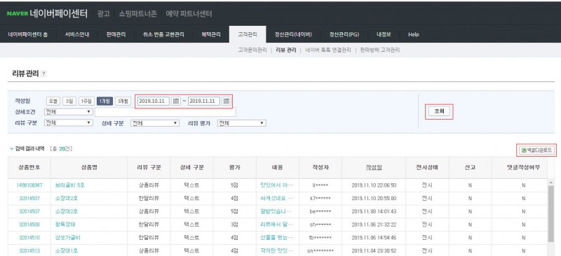 이전글 다음글 네이버 구매평 등록방법 페이지 정보 작성자 이노박스 작성일2019.11.11 관련링크 본문 1. 네이버페이센터 고객관리 < 리뷰관리에서 기간 설정 후 조회를 눌러서 엑셀파일을 다운로드 받습니다. 2. 다운받은 엑셀은 Excel97 - 2003 서식파일로 저장합니다. 3. 해당 파일은 업로드한후 네이버페이 후기 업로드를 클릭합니다. 목록